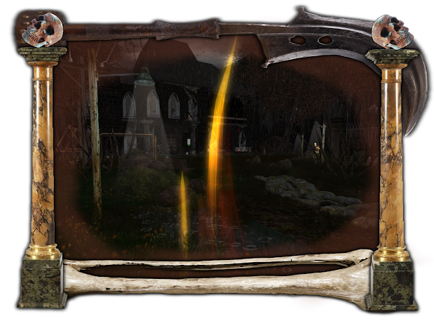 Inside the house, cobwebbed bookshelves hold secretive tomes and skulls on dusty glass shelves.